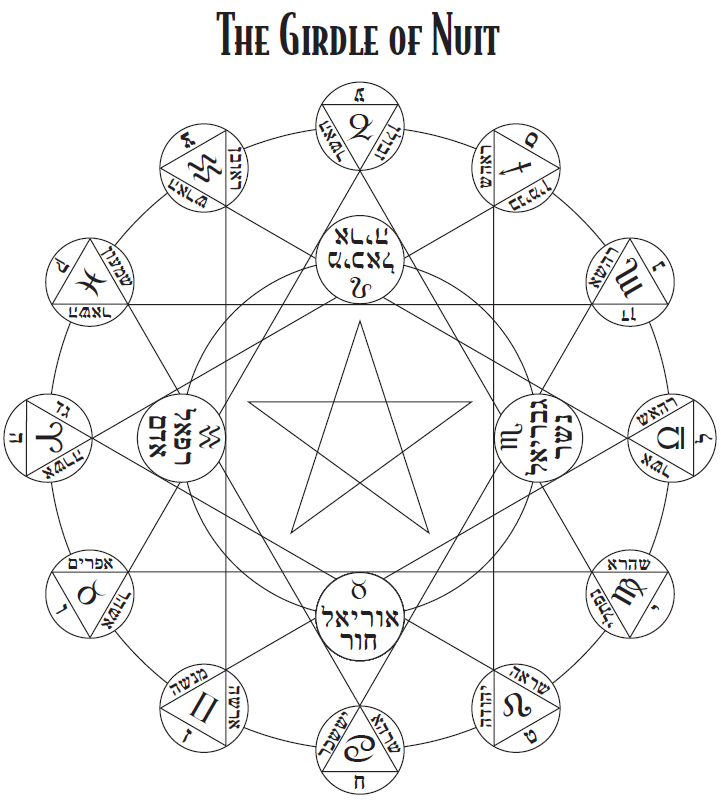 열두 개의 단순한 글자는 우주의 열두 방향에 할당되어 있으며, 그것들은 무한으로 갈라져 영원한 자의 품에 있습니다. 이렇게 설계되고 결합된 열두 글자는 황도대의 열두 천체 별자리를 형성하며, 이는 또한 누이트의 거들이기도 합니다. 그것들은 즉위 한 주권자로서 우주에 관한 것입니다. 그들은 자신의 지배권을 횡단하는 주권자로서 올해의 혁명에 있으며, 전투중인 주권자로서 모두의 중심에 있습니다.