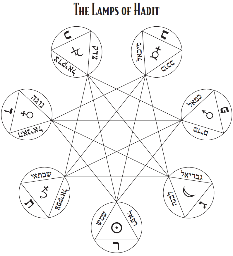 Within each circle is a triangle to represent the Three-Fold Creative Idea operating in all things. About it is the Hebrew Name of the Angel of the Planet, the Hebrew Name of the Planet, and one of the Double letters of the Hebrew Alphabet.The Seven Double Letters each have two sounds associated with them, one hard and one soft.