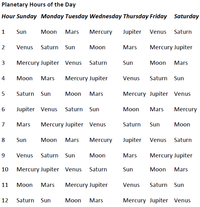 The first hour of the daylight hours is always the same as the day that it falls upon. As you can see in the chart, the other hours follow the Chaldean sequence in descending order repeated over and over. This continues seamlessly from day into day.