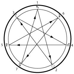If you arrange the planets in a magic circle, according to the Chaldean Order, and trace lines between them according to the perfect fifths arrangement, you get a perfect Septagram.