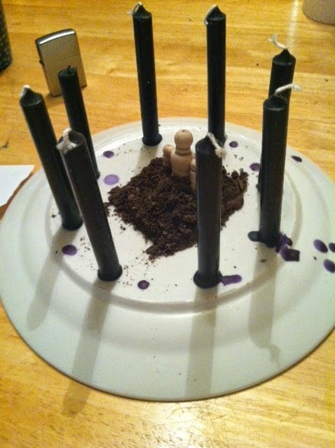 열쇠고리 크기의 아티스트 인형을 사용했고, 인형에 적의 이름을 붙인 뒤 위스키를 적셔 세례를 주었습니다.