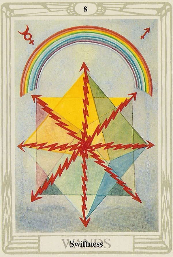 최근 서양 오컬티즘에는 혼돈의 도상학에 대한 매우 구체적인 예시가 있습니다. 그래서 우리는 필연적으로 크로울리와 그의 토트 타로 덱에 등장하는 8개의 지팡이로 눈을 돌립니다: