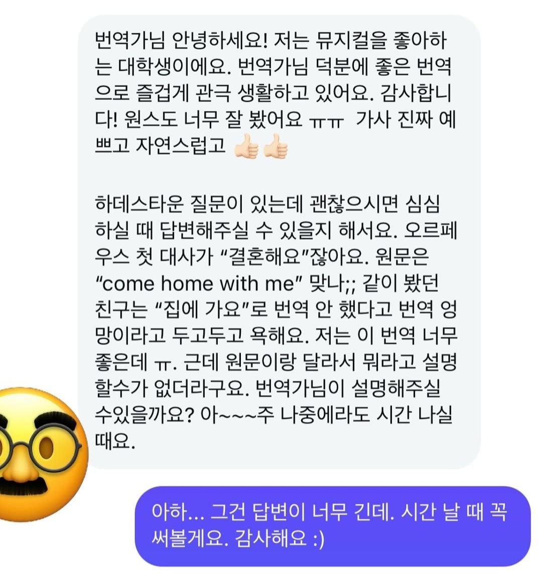 넷째, 원작자의 의향 - 번역극은 원작자의 의향이 아주 중요해요. 번역가가 쓰고 싶다고 쓸 수 있는 게 아니고 원작자, 혹은 원작자를 대리하는 해외 연출의 동의와 허락이 필요해요. 가령 ‘원스’에서도 제가 쓰고 싶었지만 연출자와 의견이 달라 쓰지 못한 것들이 있어요. ‘하데스타운’은 모두 원작자인 아나이스 미첼과 대면으로 논의하고 동의를 거쳤어요. 특히나 “come home with me” 같은 구절은 워낙 중요한 부분이라 원작자의 의지를 몇 번이고 확인했고요. 뒷 부분에도 중요하게 나오는 대사거든요. 미첼에게 상황을 설명하고 어떻게 하는 게 좋겠냐고 논의한 끝에 동의와 허락을 받은 번역문이에요. 원작자가 동의한 번역문보다 권위를 갖는 번역문은 없어요.