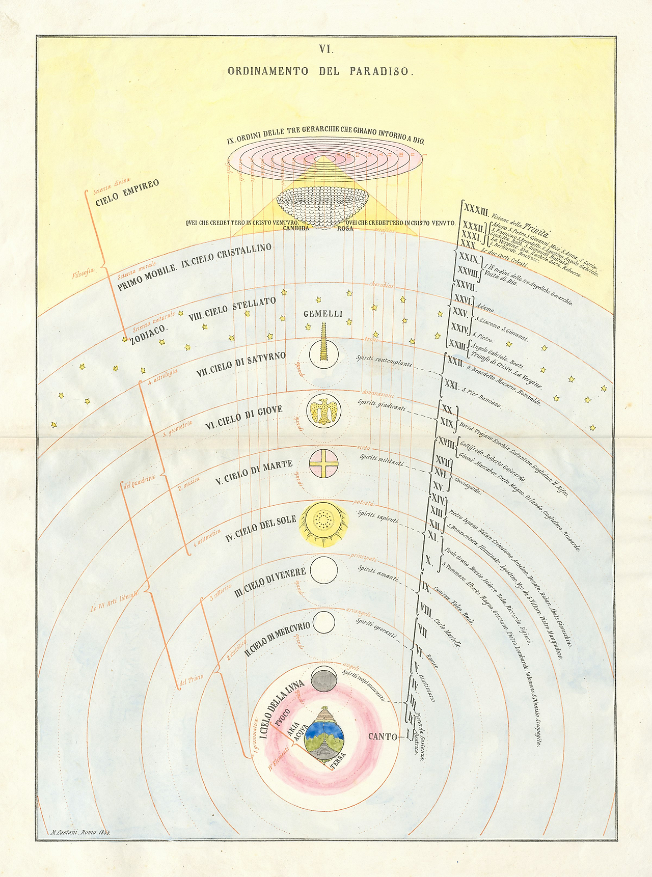 카에타니는 천국을 가장 추상적인 시점으로 선택했다. 지옥과 연옥은 이제 페이지 위 작은 점으로, 뒤로 남겨진 세계들이 되어 수성, 금성, 토성 등 다른 천구들에 둘러싸여 있습니다. 천국 정점에는 깔때기 모양의 구조물—천국의 영혼들을 위한 원형 극장 형태의 '순백의 장미(candida rosa)'—이 자리합니다. 단테는 진정한 사랑이자 안내자였던 베아트리체를 이곳에 남겨둔 채, 신과 삼위일체 앞에 나아갑니다. 이 구조는 지옥의 원뿔형 구덩이와 연옥의 계단식 테라스를 동시에 반영하며, 카에타니가 단테 서사시의 구조에 지닌 시각적 감수성을 드러냅니다.