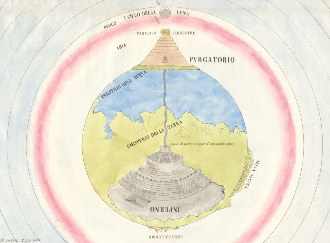 단테의 『신곡』이 출간된 이래 학자와 예술가들은 지옥의 구조를 도식화하고 연옥을 측량하며 천국의 구역을 가로지르는 길을 측정해왔습니다. 단테 세계관의 첫 우주 기록자는 피렌체의 다방면 학자 안토니오 마네티였습니다. 그의 미출간 연구는 수학적으로 지옥의 너비가 3246마일(약5224km), 깊이가 408마일(657km)이라고 결론지었으며, 이는 1506년 시의 획기적 판본에 사용된 목판화에 영감을 주었습니다. 1588년, 젊은 갈릴레오가 가세하여 루시퍼의 키와 팔 길이(각각 1200m와 340m)를 도출하고, 지옥의 아치형 천장이 브루넬레스키의 돔과 동일한 물리적 원리로 지탱된다고 제안했습니다. 이러한 학문적 전통은 수세기 동안 이어져 미켈란젤로 카에타니의 작품으로 정점에 달했습니다. 그는 일련의 지도와 도표를 설계했으며, 이는 『여섯 판에 묘사된 단테 알리기리에의 신곡』이라는 제목으로 출판되었습니다. 이 책은 두 판본으로 출간되었는데, 하나는 1855년판으로 수작업 채색 석판화를 특징으로 했고, 다른 하나는 1872년판으로 로마 근교 몬테 카시노의 수도원 수도사들이 사용한 초기 형태의 크로모리토그래피(색채 석판 인쇄법)로 인쇄되었습니다.
