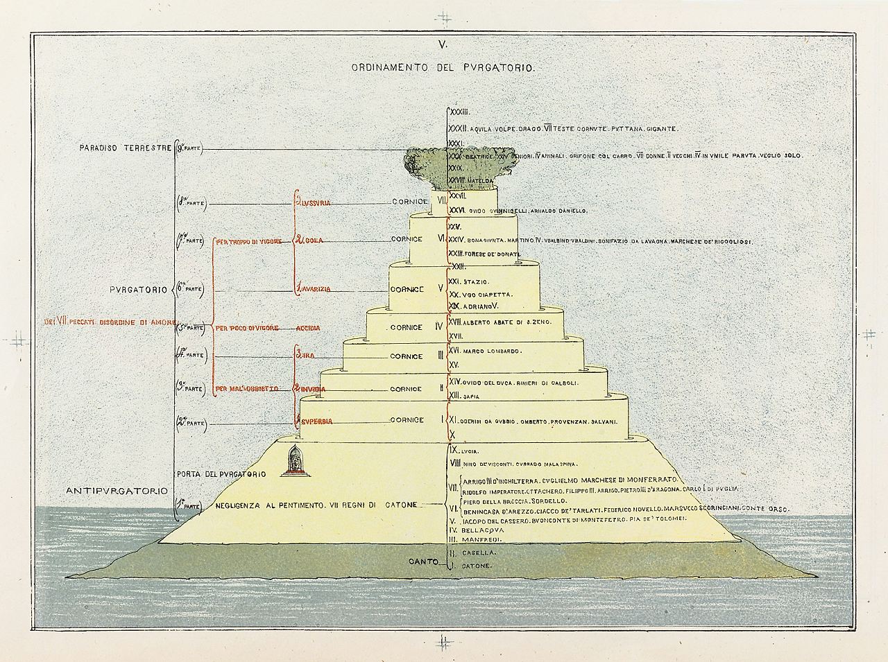연옥은 이 섬 같은 산을 항해하는 행운의 영혼의 시점에서 눈높이에 맞춰 묘사됩니다. 연옥의 계단식 구조는 동심원 형태로 위로 갈수록 작아져, 전체가 노란 웨딩 케이크를 닮았으며, 에덴의 푸른 숲에 가려진 신랑 신부 장식만 겨우 보입니다.