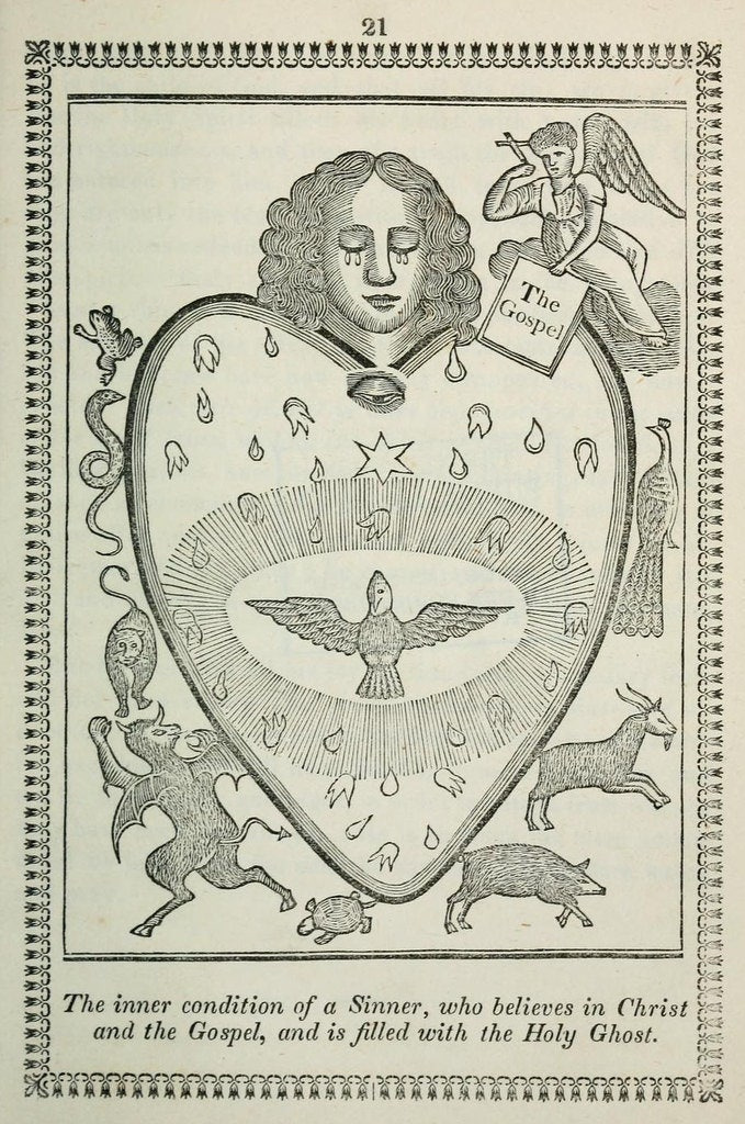 『10가지 상징적 도형으로 표현된, 그리스도인의 성품을 깨우고 증진시키기 위한 도안』(1851)은 1812년 베를린에서 "신성한" 자선가 요하네스 고스너(1773-1858)가 출판한 독일어 책의 영어판입니다. 고스너의 저작은 사실 더 오래된 텍스트를 재활용한 것으로, 프랑스어로 처음 출판된 가톨릭 상징집이었으며 고스너는 이 책이 1732년 뷔르츠부르크에서 출판된 독일어판을 통해 자신에게 전해졌다고 주장합니다. 고스너는 독자에게 보내는 서문에서 이 책의 제목을 『Geistlicher Sittenspiegel』(영적 도덕의 거울)로 밝혔으나, 피터 데일리는 『근대 유럽의 상징』(2014)에서 실제 제목은 『Geistlicher Seelen-Spiegel』(영적 영혼의 거울)이며 출판 연도는 1733년이라고 주장합니다.