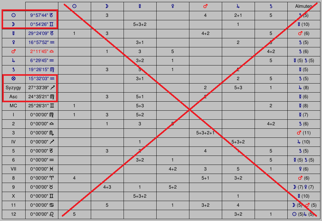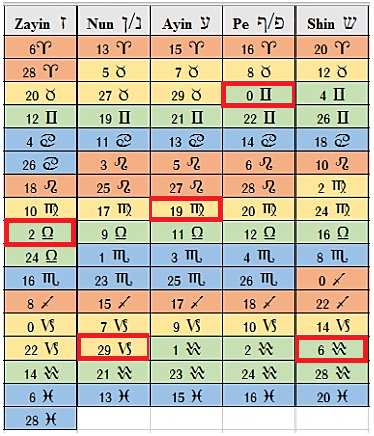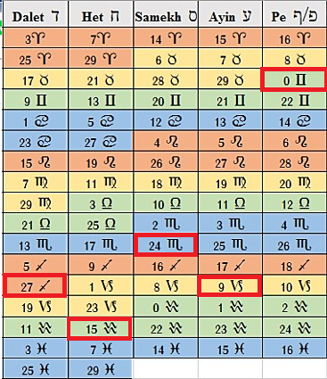 선한 천재성은 출생 차트의 알무텐 점수 순서로 5개 행성 컨정션(0도)의 히브리어 문자를 찾는다.