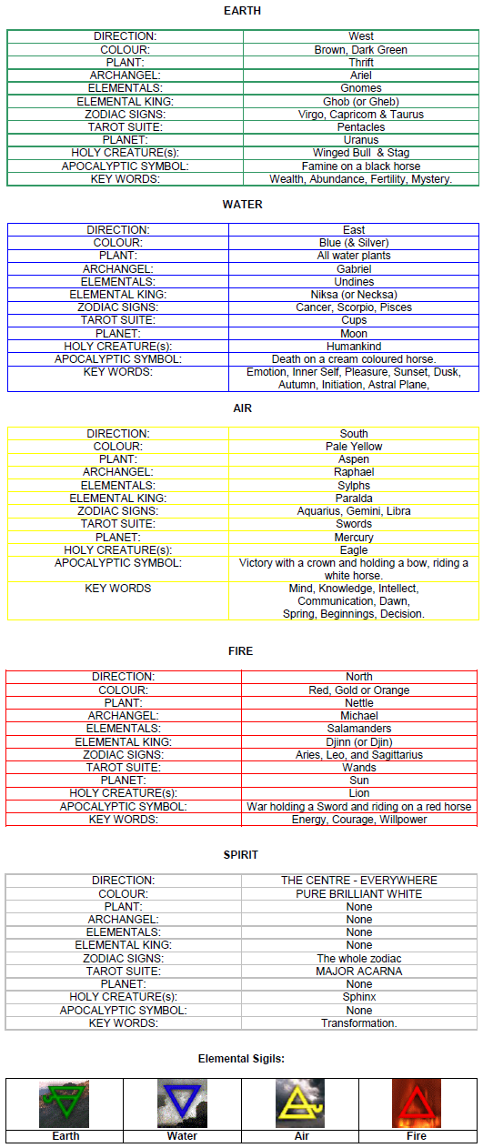 I hope all these preliminary tables of correspondences will be of help to you in your magical endeavours. You will seldom be able to incorporate everything into a single ritual, but if you get as much in as is practical, you will find that your spells and rituals will be enriched and your success rate will improve.