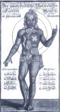 The most famous alchemical illustration of chakras and their ‘planet seals’ was conceived by Johann Georg Gichtel (1638–1710), an Alchemist from Regensburg in Germany. According to the description the picture depicts an “entirely earthy, natural, sinister man; in stars and elements” and shows how “the wheel of planets, in seven diabolical seals, is laid down on the soul”. At the time, a planetary wheel was described as the course of the seven stars around the earth. In his illustration Gichtel arranged the seven classical planets on the human body and assigned each of them to one of the seven vices or deadly sins, such as pride, stinginess and jealousy. Gichtel wanted to demonstrate the circumstances under which – more precisely under which chakra-relation – the planets evoke negative aspects in man. This planet-chakra-resonance corresponds to the lowest state of vibrancy, the Nigredo. Therefore the figure was also hatched in black.