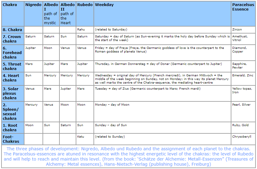 흑화, 백화, 적화의 3가지 개발 단계와 차크라에 대한 각각의 행성 할당. 파라켈수스 에센스는 차크라의 최고 에너지 수준인 루베도 수준의 공명에 맞춰져 있으며 이를 달성하고 유지하는데 도움이 됩니다.("연금의 보물 : 금속 정수" 책에서, Hans-Nietsch-Verlag, Freiburg)