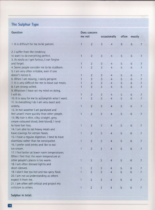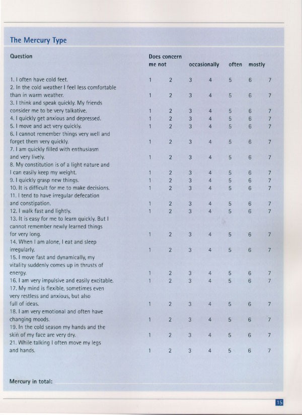 With the help of the following questionnaire the current constitutional type such as sal, sulphur or mercury can be determined. It would be ideal if the three basic principles were equally represented. When one of the principles is too dominant, it should be regulated with a specific combination of metal essences.