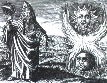 Hermes Trismegistos as a ruler of the three alchemical basic principles sal = moon (at the bottom), sulphur = sun (at the top) and mercury = fire between both of them.
