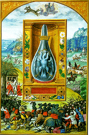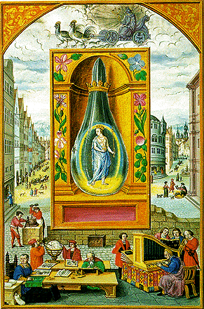 Chemically, distillation is the boiling and condensation of the fermented solution to increase it's purity, which is why this is known as the white stage of alchemy. Psychologically, the agitation and sublimation of psychic forces is necessary to ensure that no impurities from the ego or id are incorporated into the next and final process. "It Rises From The Earth to Heaven and Descends Again to Earth" is how the tablet describes the operation, which represents the second or higher application of the Water element in the tablet. The alchemist thought of this phase as working with the heavenly element Mercury to extract and refashion the metals. The ferment, the soft amalgam or balsam resulting from this operation, must be hardened into a Stone before it can be made permanent, and the final phase of Distillation is a Sublimation in which the vapor turns solid, or the Spirit is made Corporeal.