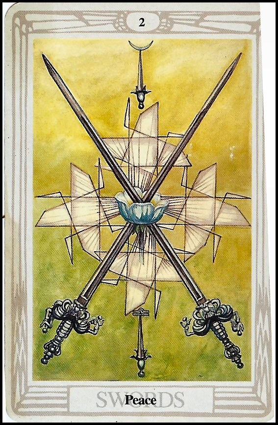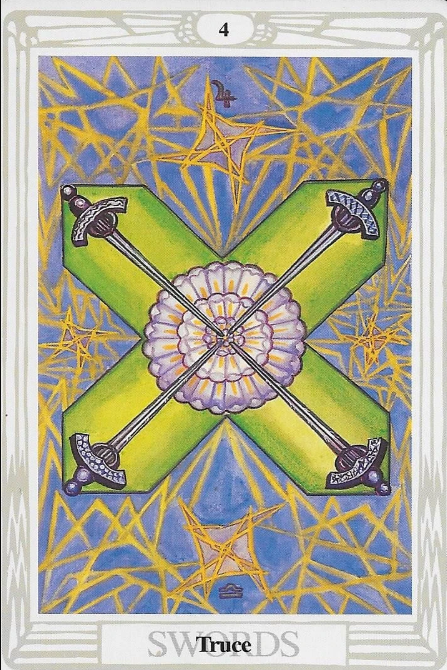 당신이 존재하는 휴전은 당신이 스스로 정한 삶의 관습, 무질서에 대한 명령 안에 있습니다. 이것이 당신이 정리하는 방식이든 자신을 통제하는 방식이든, 작은 방식으로 권위를 부과하는 방식이든, 그것은 모두 휴전을 유지하는 것입니다. 상자에서 벗어나 더 이상 생각하지 않기 위해 회유 보상(평화)을 만들고 있습니다. 그러나 크로울리가 이 카드로 결론을 내리기 때문에 결정을 내리는 것은 엉망이 될 수 있습니다.